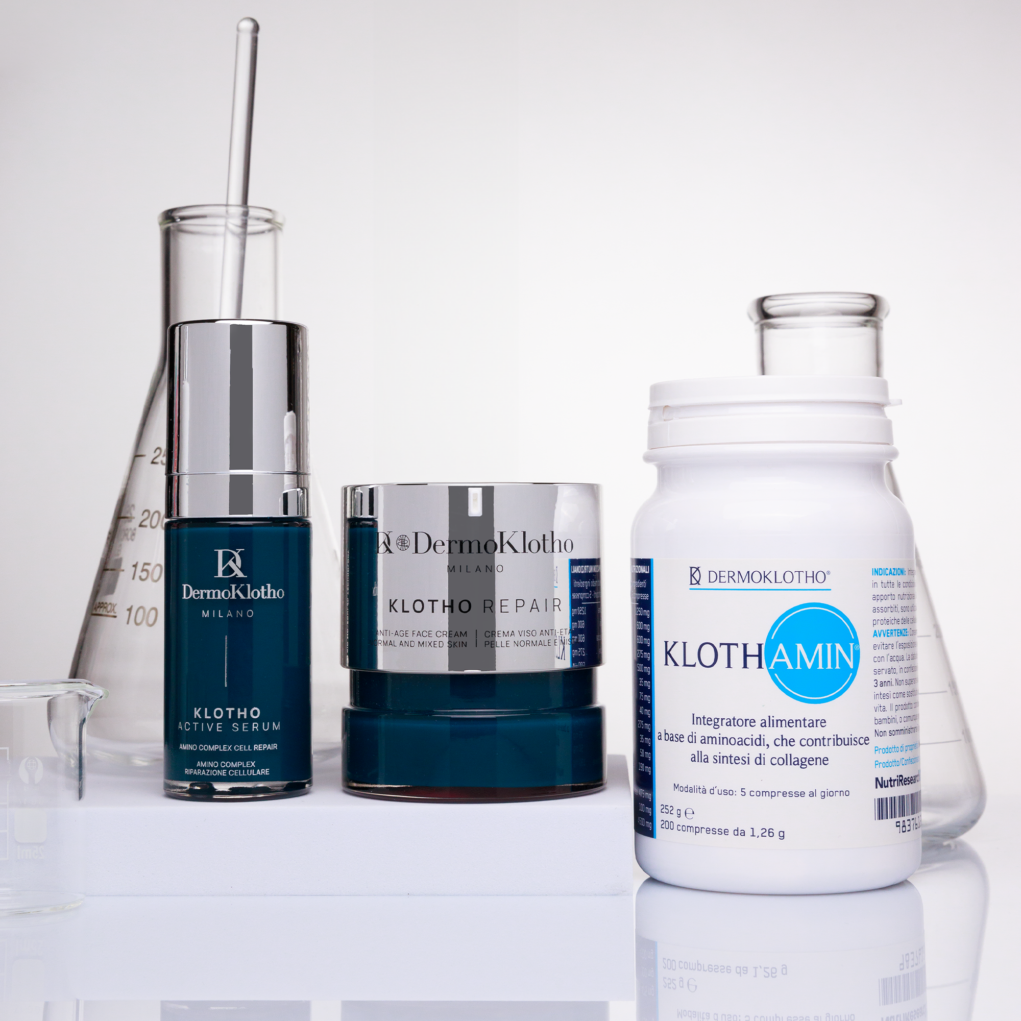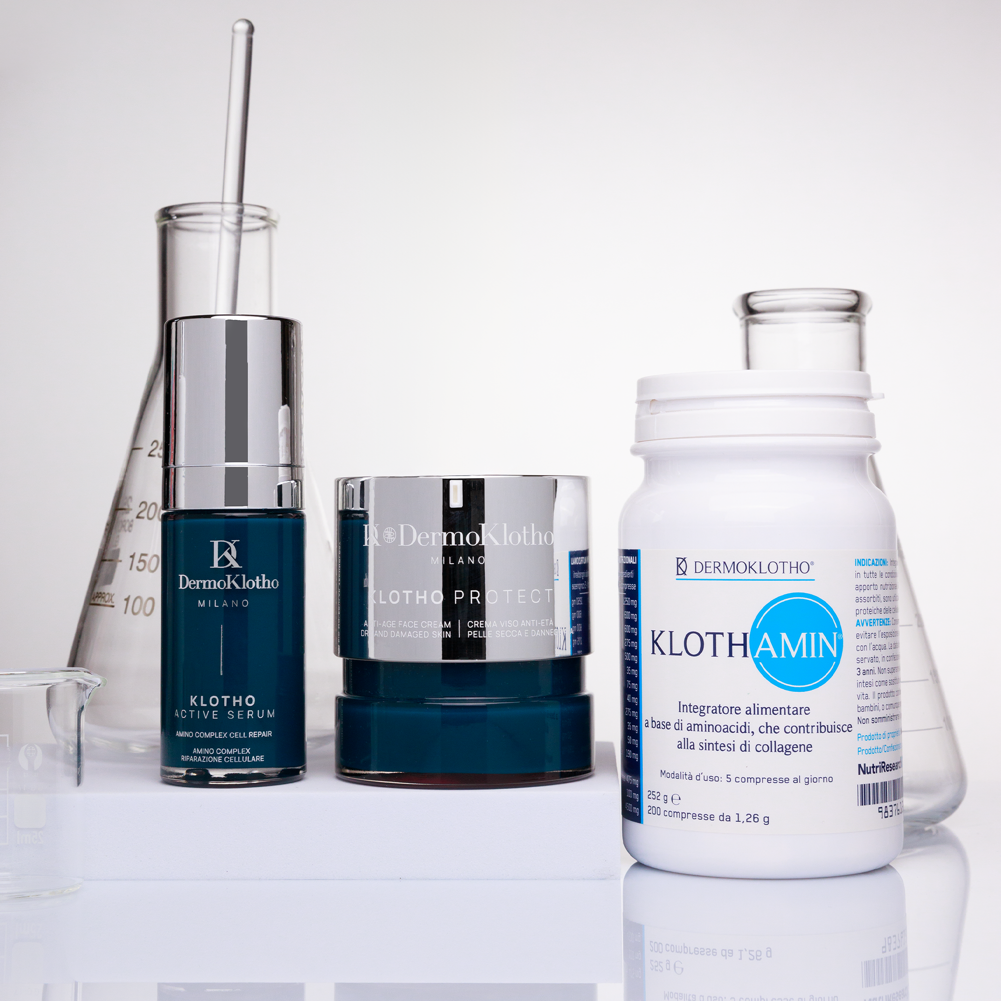 First scientific research, then products: it is science that guides us in formulating the amino acid mixtures contained in Dermoklotho's dermocosmetics. Our approach is scientific, we start with the research programmes, test them in the laboratory and from the results we obtain the guidelines to optimise mixtures that guarantee the best results on your skin cells. This is the only way we are sure to offer you products with tested efficacy which really provides a protective and anti-ageing effect.