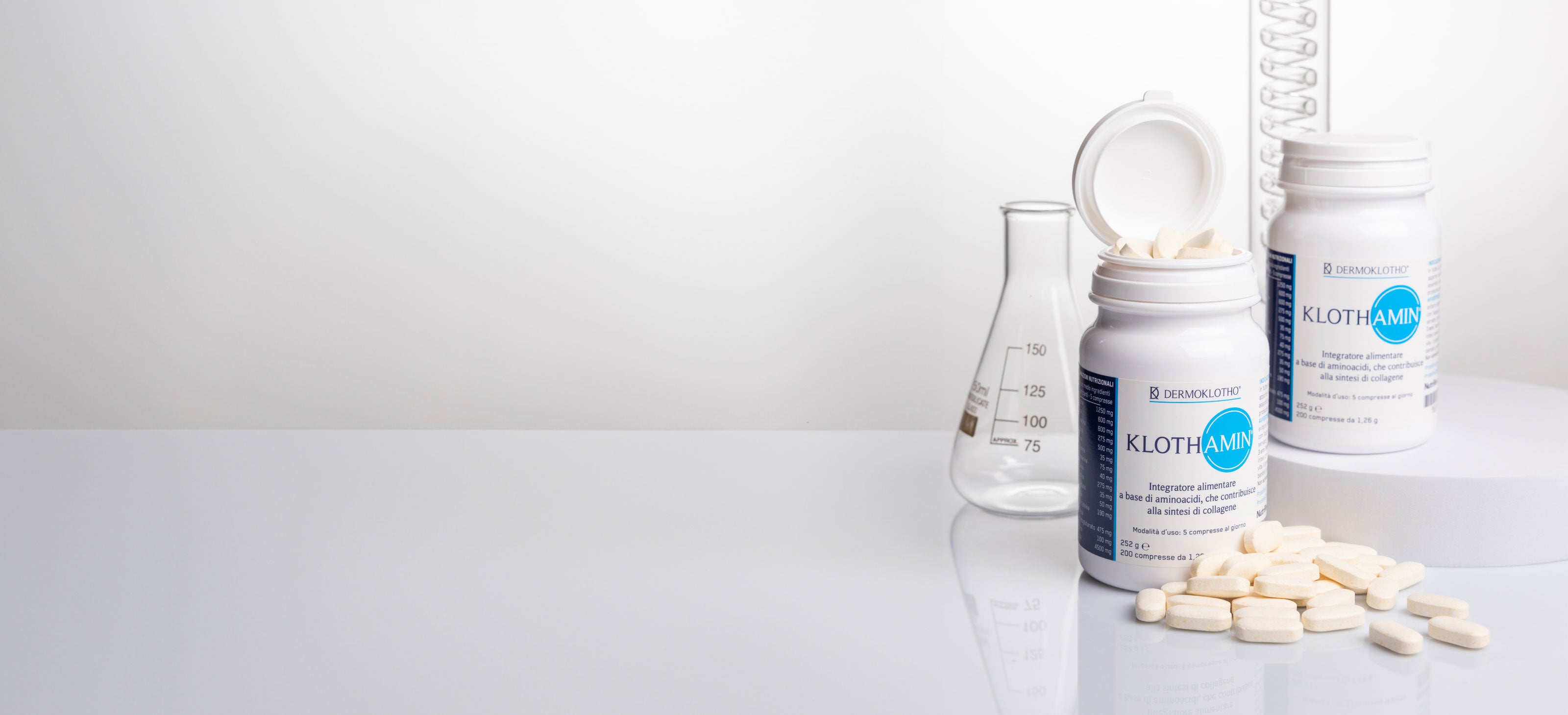 It is the essential amino acids that maintain and promote collagen integrity. Taking enough of them is, therefore, very important for fibroblasts throughout the body and, in particular, for the skin’s health. This is precisely why we have formulated Klothamin, the amino acid food supplement that cares for your skin 'from the inside out'.